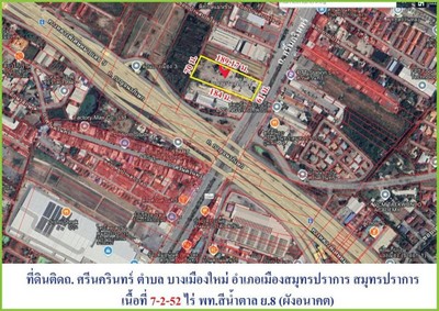 ขายถูกที่ดินติดถนนศรีนครินทร์ขึ้นตึกสูงได้ เนื้อที่ 7-2-52 ไร่ (3,052 ตรว.) ต.บางเมืองใหม่ อ.เมืองสมุทรปราการ สมุทรปราการ