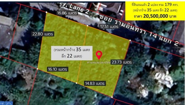– ที่ดินทรงสี่เหลี่ยมสวย 2 แปลงติดกันรวม 179 ตารางวา ถมแล้วสูงกว่าถนน หน้ากว้าง 35 ม.ลึก 22 ม.