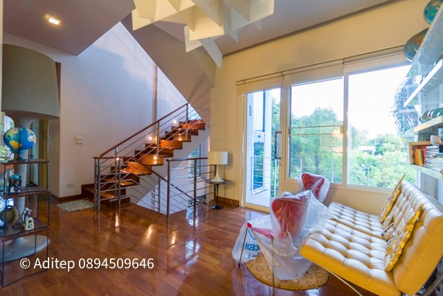ขนาด 3 ชั้นครึ่ง เนื้อที่ 92 ตร.วา พื้นที่ใช้สอย 540 ตร.ม. 3 ห้องนอน 5 ห้องน้ำ 1 ห้องทำงาน ที่จอดรถ 2 คัน หน้าบ้านหันทิศเหนือ แอร์ 9 เครื่อง ระเบียงกว้าง มีสระน้ำพุข้างบ้าน