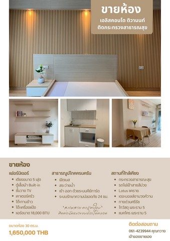 ขายห้อง “เอลิส คอนโด ติวานนท์” เฟอร์นิเจอร์ครบพร้อมอยู่! ทำเลดีใกล้กระทรวงสาธารณสุข เดินทางสะดวก