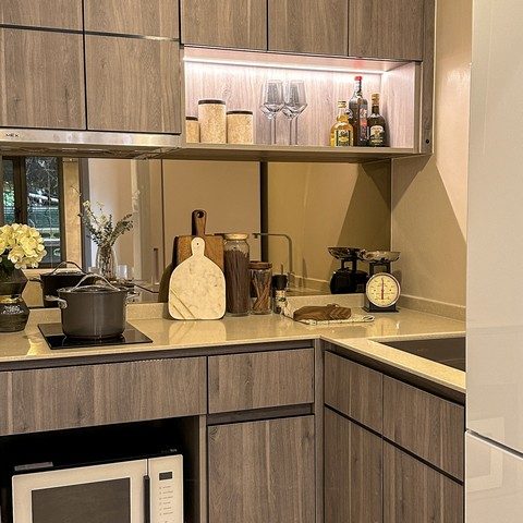 – เคาน์เตอร์ครัว Built-in พร้อมเตาไฟฟ้า เครื่องดูดควัน และ Top หินควอตซ์