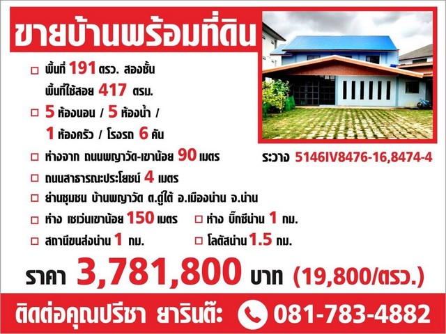 ขายบ้านเดี่ยว 2 ชั้น พร้อมที่ดิน อำเภอเมืองน่าน จังหวัดน่าน เนื้อที่ 191 ตารางวา